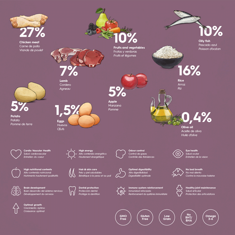 בשר עוף 27%, אורז 16%, שומן עוף (מועשר בויטמין E), דגים 10%, בשר כבש 7%, אפונה 6%, תפוח אדמה 5%, תפוח 5%, שמן סלמון, פירות וירקות 4% – אגס, סלק, גזר, עגבנייה, פירות אדומים, פירות הדר), זרעי פשתן, ביצים 1%, חלב 0.5%, שמרי בירה, פוטסיום כלוריד פורמולת פרוביטל: פירות: שמן זית 0.4%, תפוז, לימון, ענבים, אוכמניות,פירות אדומים ירקות: תרד, אספסת, ברוקולי, מלפפון, שמן זיפן, עולש (מועשר בפרוביוטיקה), שום, שמיר, טימין, יוקה שידריגה, שמיר, פלפל מתוק. פירות ים: סרטנים (מקור טבעי לגלוקוזמין), סחוס (מקור טבעי לכונדרוטין) קריל, רכיכות, אצות ים ( ספירולינה 0.1%), מולי ים. תמציות צמחי מרפא: ציפורן החתול, תמצית זרעי שן הארי, תמצית עלי מנטה, תמצית זרעי תה ירוק, קמומיל, תמצית זרעי אורגנו, תמצית רוזמרין, תמצית אלוורה, צמח הליקריץ’. פרוביוטיקה.